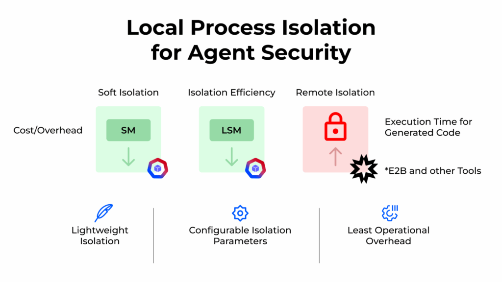 Our solution leverages the power of Linux Security Modules (LSMs) directly within the host operating system where the agent or MCP server runs. It enforces security policies at the kernel level, providing “soft isolation” by strictly controlling process behavior (e.g., file access, network connections, execution permissions). Its primary advantages are extremely low overhead, high speed, and minimal operational complexity, making it suitable for performance-critical applications or environments where full remote isolation is impractical.