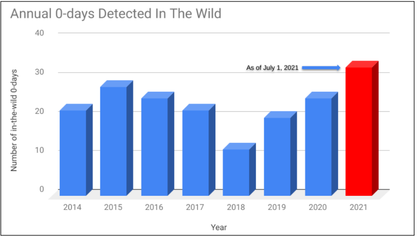 | How many zero days exist? | Hundreds were exploited yearly; tracking rose to 80+ in 2021 (medium.com, startupdefense.io, ibm.com, wired.com, fortinet.com, vationventures.com). |