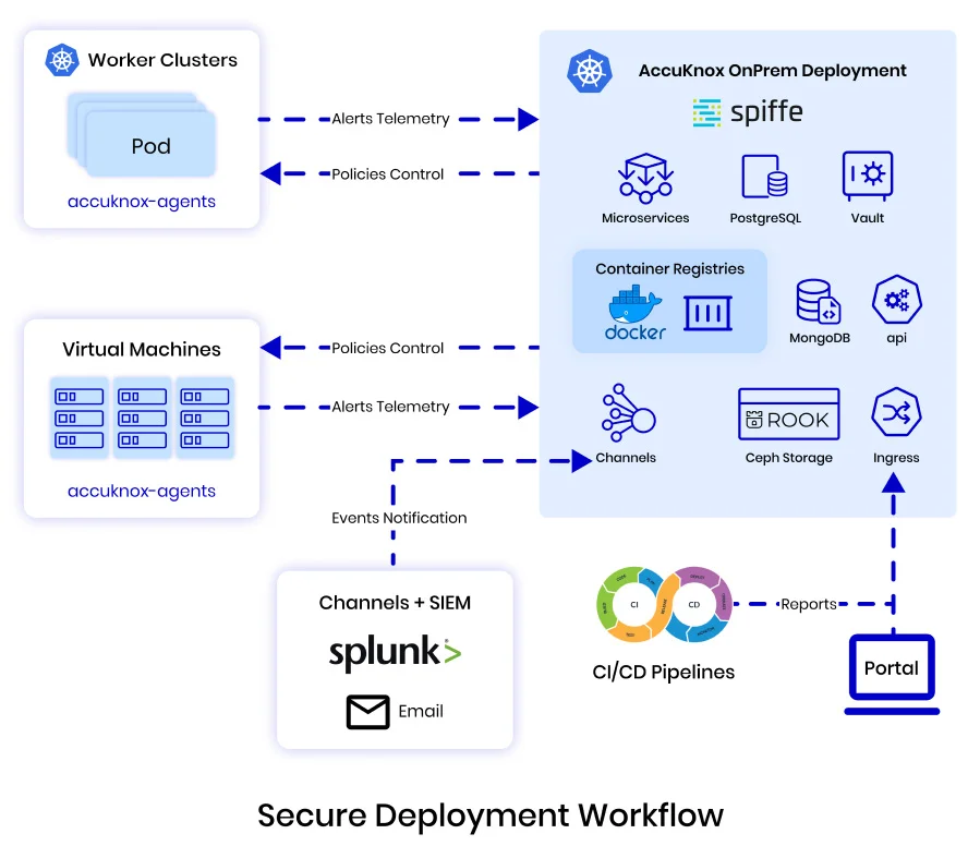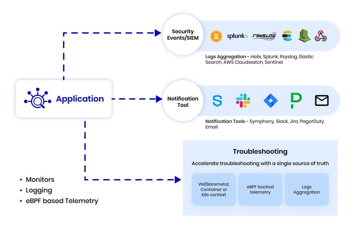 AccuKnox supports gathering telemetry from different workloads run on the public cloud, private cloud, or VM/bare metal and provides MFA-based login and encryption for the telemetry sent to SIEM tools.