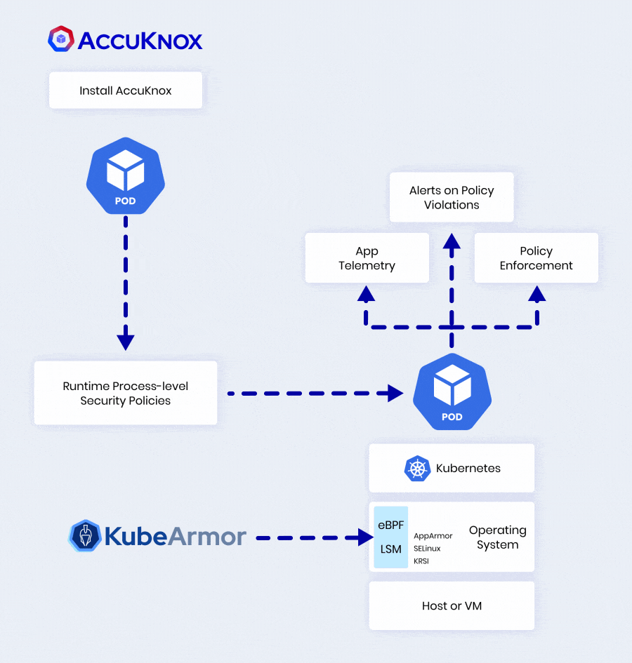 They hook low-level events (syscalls, file, network) to enforce least-privilege at pod level. Our product uses eBPF + LSMs (AppArmor/SELinux) via KubeArmor to block unauthorized behaviors inline. Dive into KubeArmor runtime enforcement and implementing runtime security with KubeArmor for architecture and policies.